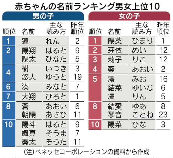男は蓮 女は陽葵が最多 赤ちゃん名前ランキング 日本経済新聞